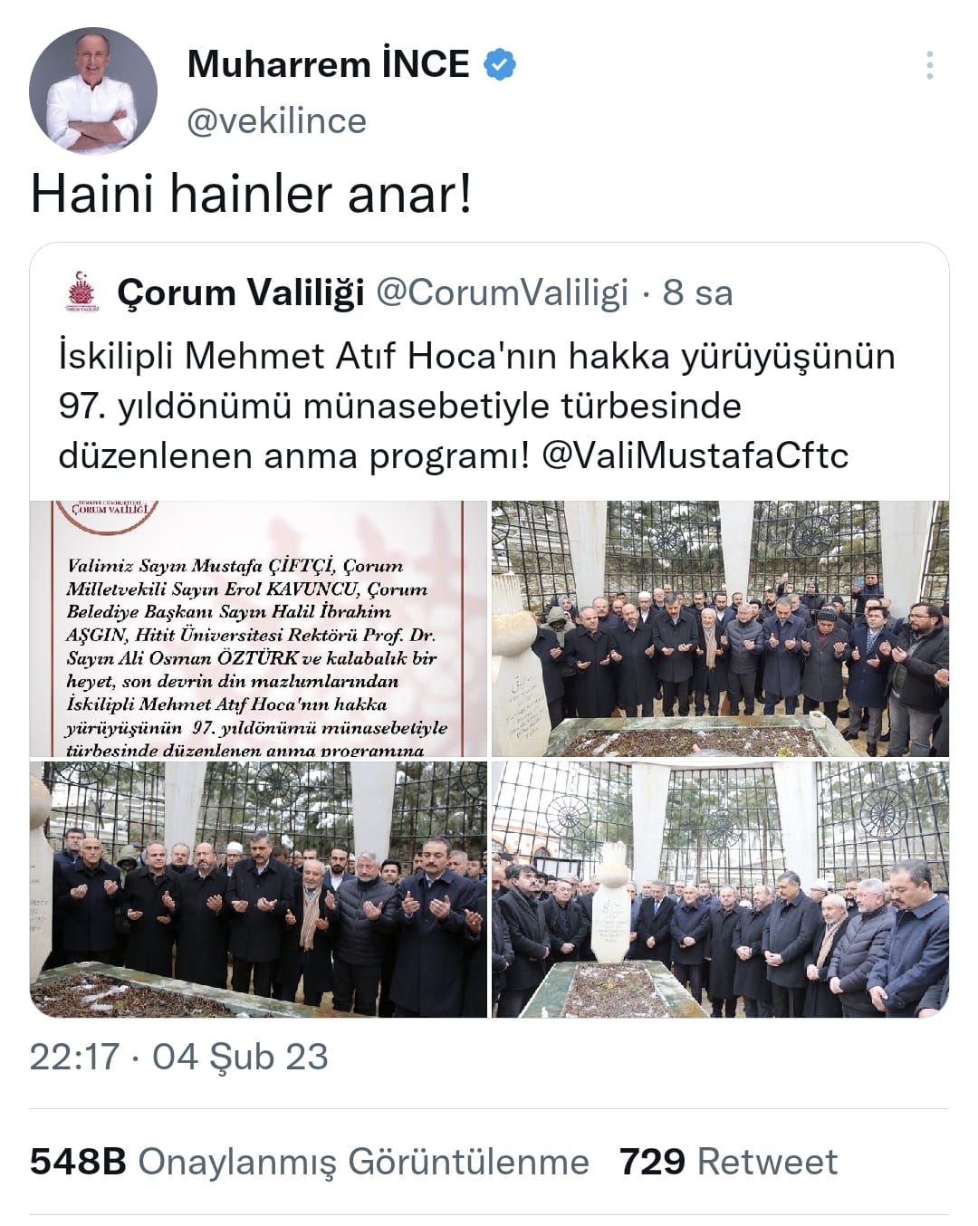 Çorum Valisi Mustafa Çiftçi’nin İskilipli Atıf Hoca’yı anma etkinliğine katılması üzerine Kemalistlerin Twitter’da kopardığı yaygaradan örnekler:
