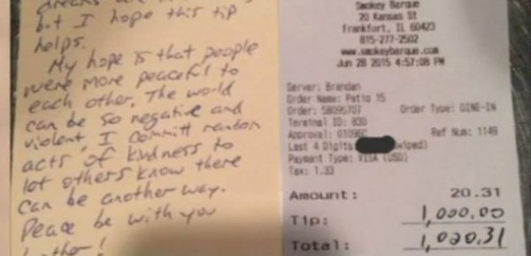 Gizemli müşteri gelen hesabın yaklaşık 50 katı bahşiş verdiği genç garsona bir de mesaj bıraktı: “Brendan, nazik hizmetlerin için teşekkürler. Garson olarak harika bir iş çıkarıyorsun. Hayatta umutlarının ve hayallerinin ne olduğunu bilmiyorum, ama umarım bu bahşiş işe yarar. Umudum şu ki insanlar birbirlerine karşı daha barışçıl olmalı. Dünya çok olumsuz ve zorlu olabilir. Ben insanların başka bir yol olduğunu bilmeleri için rastgele iyilik yapıyorum. Esen kal, kardeşim!” (Son Devir )