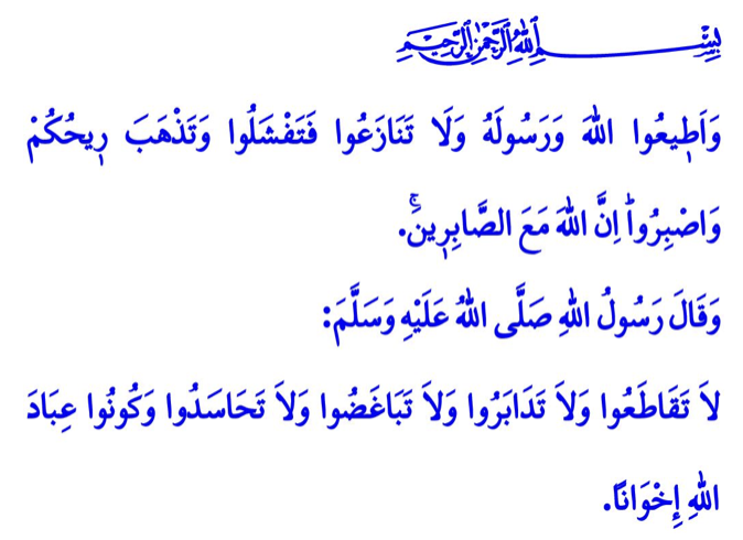 Okuduğum ayet-i kerimede Yüce Rabbimiz şöyle buyuruyor: “Allah’a ve Resûlüne itaat edin ve birbirinizle çekişmeyin. Sonra gevşersiniz ve gücünüz elden gider. Sabırlı olun. Çünkü Allah sabredenlerle beraberdir.”[1]