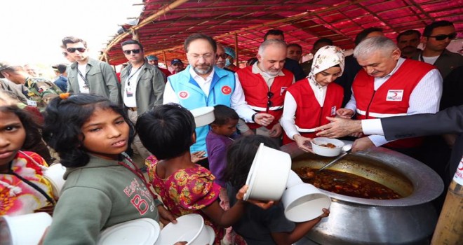 Başbakan Yıldırım ve beraberindeki heyet, bölgede yürütülen insani yardım çalışmaları hakkında bilgi alarak Arakanlı Müslümanlara yemek ve insani yardım dağıttı.