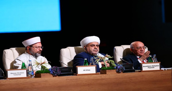 Azerbaycan Kafkas Müslümanları İdaresi (KMİ) öncülüğünde Bakü Kongre Merkezi’nde düzenlenen zirvenin açılışında konuşan Diyanet İşleri Başkanı Erbaş, İslam’ın, insanlığın dünya ve ahiret huzurunu temin edecek ilkeleri getirdiğini ifade ederek, “Bütün Peygamberler tevhidin, adaletin, güzel ahlakın yaşanması için mücadele etmiştir. Dolayısıyla Müslümanlar ırkı, inancı, rengi, dili, coğrafyası, kültürü ne olursa olsun herkesin temel hak ve özgürlüklerini savunmayı inançlarının gereği kabul etmişlerdir” dedi.