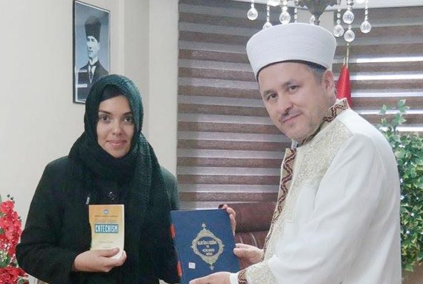 Beykoz İlçe Müftülüğü'ne nişanlısının annesi ve müstakbel kayınvalidesiyle birlikte gelen Elif Hanım, daha önce Portekizce mealini okuduğu Kur'an-ı Kerîm'i Türkçedilini öğrendikçe ve Türkiye'de yaşadıkça daha iyi kavrayacağını ifade etti. İslamiyet'i seçen Elif Hanım'ın oldukça mutlu ve heyecanlı olduğu gözlerden kaçmazken, Müftü Hüseyin Demirtaş'ın okuduğu Arapça ayetleri dikkatli bir şekilde de dinlediği gözlendi. Kaynak: Dost Beykoz