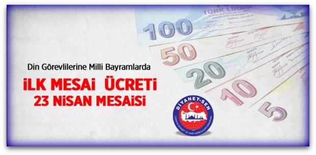 DiniHaberler.com.tr: 3. Dönem Toplu Sözleşme kazanımlarından olan Din Görevlilerine milli bayramlarda da mesai ücreti uygulaması 23 Nisan Ulusal Egemenlik ve Çocuk Bayramı’nda Cami ve mescitlerde görev yapan imam- hatip ve müezzin kayyımlara 15 Mayıs 2016’da maaşlarının yatması ile birlikte mesaileri de yatacak. Böylece din görevlileri dini bayramların yanında milli ve ulusal bayramlarda da fiili çalıştıkları günler için ilk mesai ücretlerini bu ay itibari ile almış olacaklar.