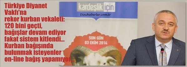 <p> Türkiye Diyanet Vakfı'na rekor kurban vekaleti: 120 bini geçti, bağışlar devam ediyor fakat sistem kitlendi... Kurban bağışında bulunmak isteyenler on-line bağış yapamıyor...</p> <p></p>