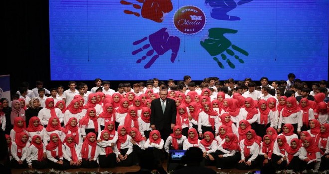 15 Temmuz'da ezanına ve bayrağına el uzatanların başını ezeceğini tüm dünyaya ilan eden bir ecdadın mirasını devralacak nesle yakışan duruşun buradaki öğrencilerin duruşu olduğunu söyleyen Erdoğan, "Ben yeni nesilden, yani sizlerden ümitliyim. Allah'ın rahmetinden ümidimizi kesmeyeceğiz. Tarihini, kültürünü, medeniyetini bilen, kendini her alanda en iyi şekilde yetiştiren bir neslin geldiğine inanıyorum, bu nesli karşımda görüyorum. İnşallah sizler ülkemizi ve milletimizi bugün bulunduğu yerden çok daha ilerilere taşıyacaksınız" diye konuştu.
