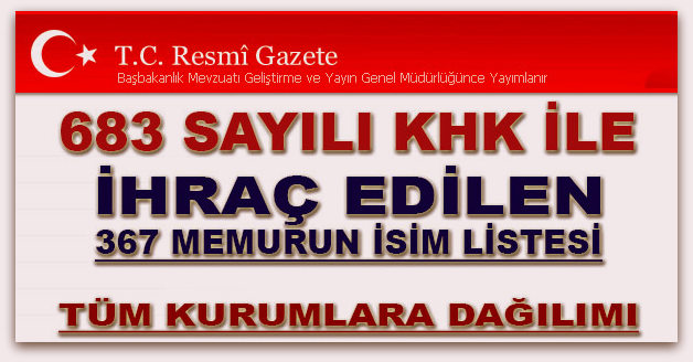 DİYANET HABER- Görevden ihraç edilen listeleri içeren 683 sayılı Kanun Hükmünde Kararname, Resmi Gazetede yayımlandı. Buna göre çeşitli devlet kurumlarından 367 personel görevden ihraç edildi. İşte o liste