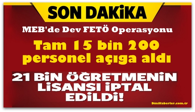 Milli Eğitim Bakanlığı merkez ve taşra teşkilatında görev yapan 15 bin 200 personeli açığa aldı. Özel kurumlarda görev yapan 21 bin öğretmenin lisansı iptal edildi.