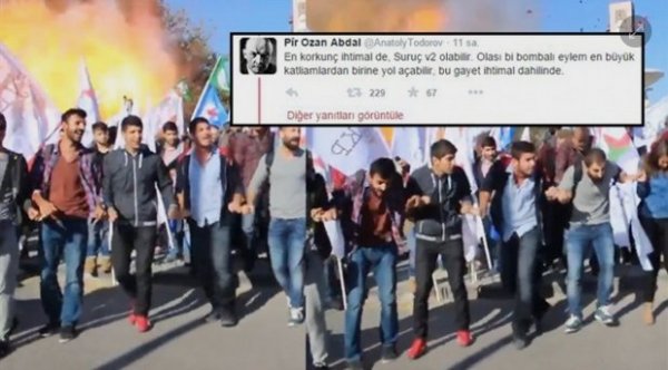Ankara'da çok sayıda kişinin hayatını kaybettiği korkunç saldırıya ilişkin dün geceden twitter'da yazılan çarpıcı bilgiler oraya çıktı. Twitter'da Pir Ozan Aptal (@AnotolyTodorov) isimli PKK yanlısı paylaşımlar yapılan hesaptan, “En korkunç ihtimal de, Suruç v2 olabilir. Olası bi bombalı eylem en büyük katliamlardan birine yol açabilir, bu gayet ihtimal dahilinde. Mitingin yasal olması katliamın siyasi çıkara dönüşmesine vesile olur, bu durum bile böyle bi saldırının ihtimalini arttırıyor" şeklinde öngörüler paylaşıldı.