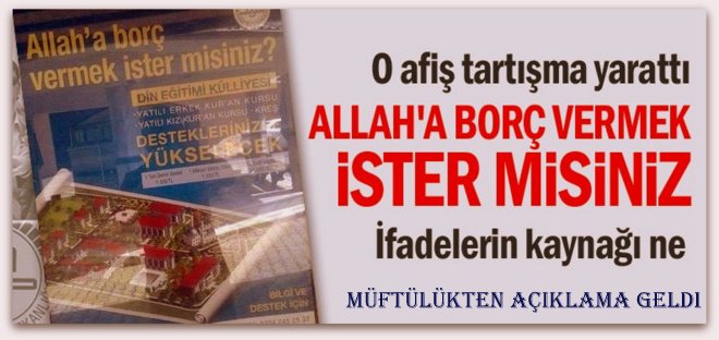 Söz konusu afiş bundan iki yıl önce “ Eğer siz Allaha güzel bir borç verirseniz, Allah onu size, kat kat öder ve sizi bağışlar…” (Teğabun Suresi 17) ayetinden alıntı yapılarak iyi niyetle hazırlanmış fakat yanlış anlaşılmalara vesile olacağı düşüncesiyle basımı ve yayımı iptal edilmiştir.