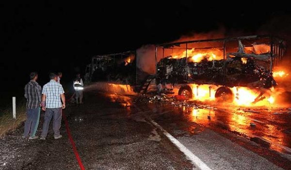 PKK mensubu bir grup Doğubayazıt-Iğdır ve Doğubayazıt-İran karayolunda 3 tırı durdurdu. Sürücüleri araçlardan indiren grup, daha sonra benzin dökerek 3 tırı ateşe verdi.