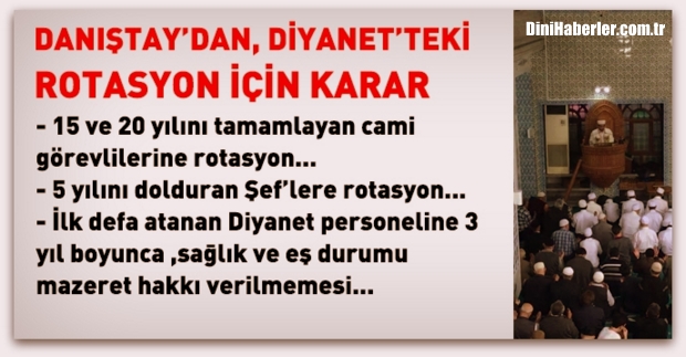 Danıştay 16. Dairesi, Diyanet İşleri Başkanlığında çalışan şeflerden 5 yılını dolduranların görev yerlerinin değişmesini öngören maddeyle ilgili olarak yürütmeyi durdurma kararı verdi.