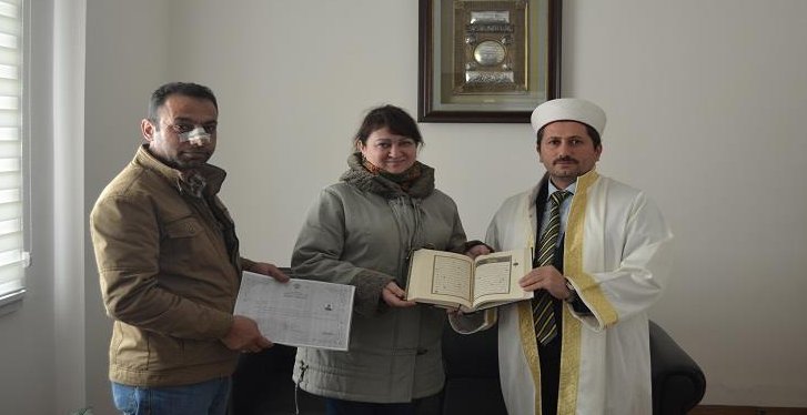 Müslüman olan Tetiana Kokosha’ya İl Müftü Yardımcımız Mehmet Yaman tarafından İhtida Belgesinin yanı sıra Kur’an-ı Kerim hediye edildi.