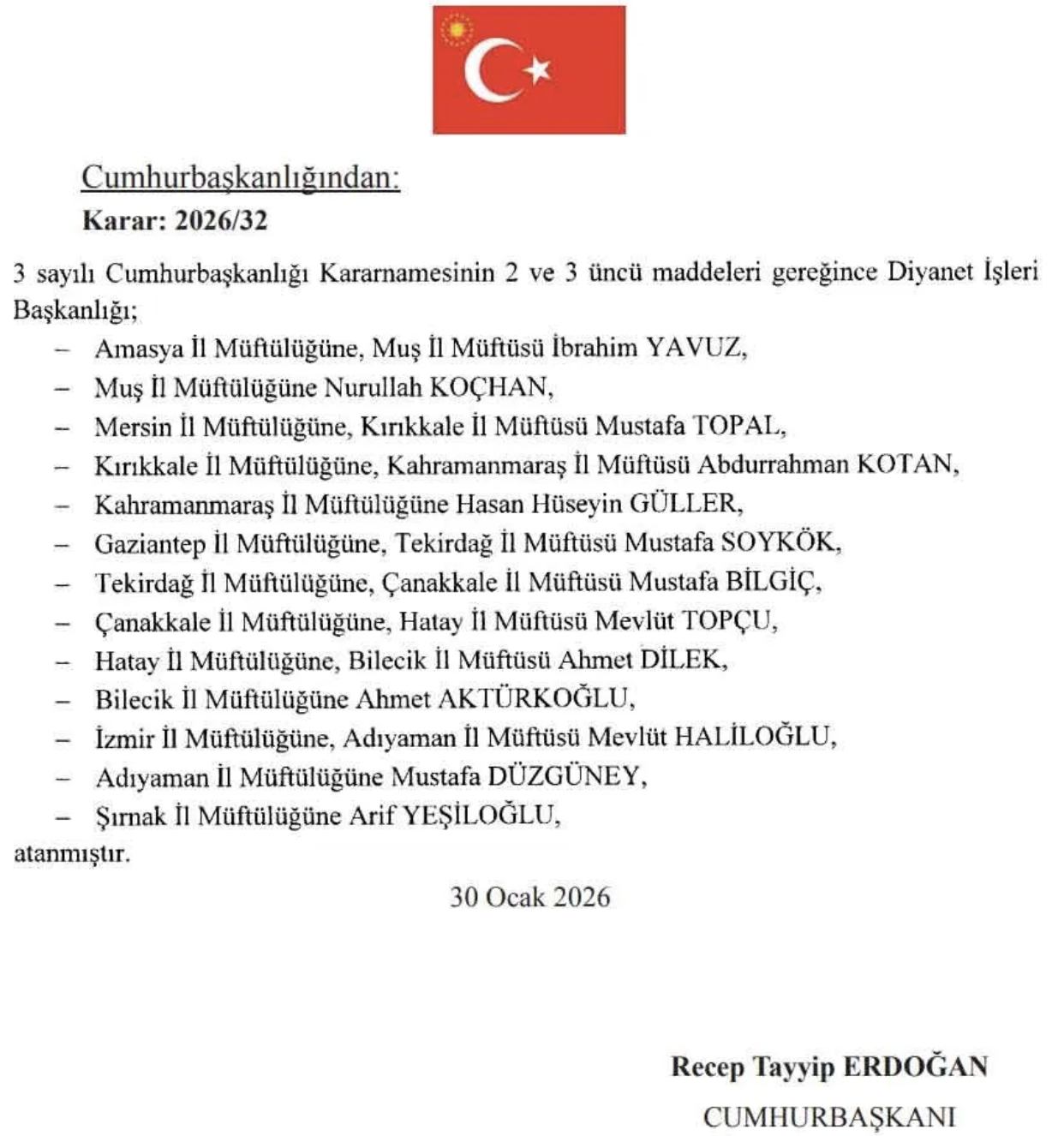Cumhurbaşkanı Recep Tayyip Erdoğan'ın imzasıyla İl Müftüleri Kararnamesi Resmi Gazete'de yayımlandı.