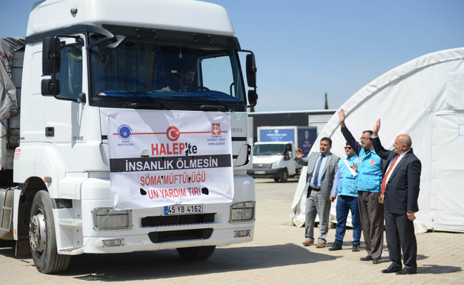 Diyanet İşleri Başkanlığı ve Türkiye Diyanet Vakfı (TDV) iş birliğinde düzenlenen "Halep'te İnsanlık Ölmesin" kampanyası kapsamında, Kilis, Elazığ, Manisa’nın Soma ilçesi ve İstanbul Kâğıthane’den temin edilen insani yardım malzemeleri ile Suriye'deki ihtiyaç sahiplerine gönderildi.