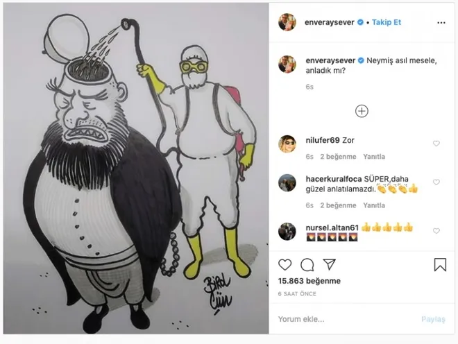 Enver Aysever'in dün önceki gün sosyal medyada paylaştığı karikatürde, korona virüs salgını sonrası görmeye alıştığmız tıbbi kıyafetler içerisindeki bir kişi; cübbe, şalvar, sakal, takke ve tesbihiyle "Müslüman" olarak tasvir edilen bir diğer kişinin kafasının içerisini ilaçlıyor. Aysever, Müslümanlara hakaret eden karikatürü "Sadece bu sorun!" ifadesiyle paylaştı. Aysever'İn, gazetecilik kisvesi altında Müslümanlara hakaret eden paylaşımına sosyal medyadan tepki yağdı. SABAH'ın ulaştığı son bilgiye göre iki isim için soruşturma başlatıldı.