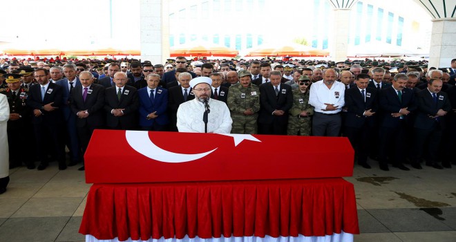 Çok sayıda vatandaşın saf tuttuğu cenaze namazı öncesinde konuşan Diyanet İşleri Başkanı Erbaş, “Allah yolunda vatan, bayrak, millet ve ezan için sınır boylarında, ülkemizin her noktasında terörle mücadele esnasında fedayı can eden şehitlerimizi bağrımıza basıyoruz. Rabbim makamlarını cennet eylesin. Vatanımızı, milletimizi her türlü kötülüklerden, her türlü ihanetten muhafaza buyursun. Birliğimizi, beraberliğimizi, dirliğimizi ilelebet payidar eylesin” dedi.