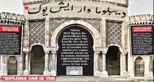 Türk Eğitim Derneği (TED) tarafından hazırlanan '2015 Eğitim Değerlendirme Raporu' yayınlandı. Raporun, 'Uluslararası Alanda Türkiye' başlıklı bölümünde ülkemizdeki üniversiteli işsizlere dikkat çekildi. Söz konusu araştırmada üniversitelerin ve üniversite mezunu sayısının artmasına rağmen aynı oranda istihdam sağlanmadığı için üniversiteli işsizlerin oranının son 14 yılda iki katından daha fazla arttığı vurgulandı.