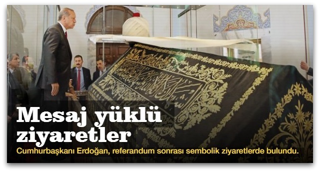 Cumhurbaşkanı Tayyip Erdoğan, millet iradesinin önündeki tüm engelleri kaldıran tarihi referandumun ertesi günü, yaptığı ziyaretlerle, hem vesayete kapı aralayan eski sistemin değişmesi için emeği geçen siyasi liderlere vefasını gösterdi hem de İslam dünyasına ve Batı ülkelerine mesaj verdi. Ziyaretler, Erdoğan’ın geçmişe bakışına, durduğu yere, bundan sonra Türkiye’nin izleyeceği yola dair mesajlarla yüklüydü. Ziyaret yerleri ayrıca İslam dünyasına ve Batı’ya yönelen sembolik işaretlerle doluydu.
