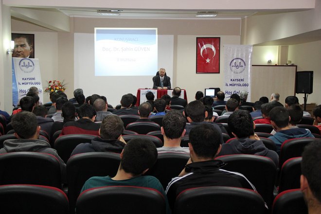 İl Müftüsü Doç. Dr. Şahin Güven tarafından Yüksek Öğrenim Kredi ve Yurtlar Kurumu Kayseri Erciyes Erkek Yurdunda Üniversite Öğrencilerine 01-07 Ekim “Camiler Haftası” münasebetiyle “Cami ve Kitap” konulu konferans verildi.