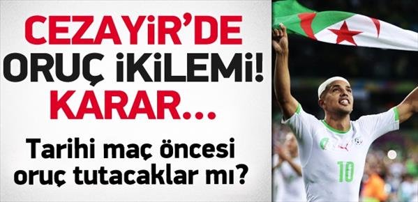 <p> Cezayir'de birçok futbolcu oruç tutuyor.<br/><br/> Bazı futbolcular ise hayati Almanya maçı için oruçlarını başka gün tutma kararı aldılar.2014 Dünya Kupası son 16'da Almanya ile karşılaşacak o