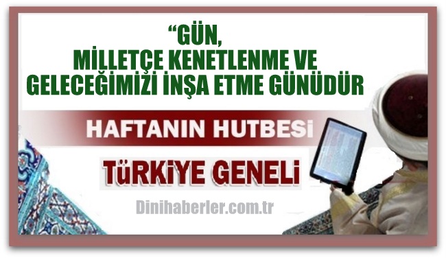 Türkiye Genel... Diyanet İşleri Başkanlığı tarafından hazırlanan “GÜN, MİLLETÇE KENETLENME VE GELECEĞİMİZİ İNŞA ETME GÜNÜDÜR” isimli hutbe 22.07.2016 Cuma günü Türkiye geneli bütün camilerde okunacaktır. Diyanet Cuma hutbesinin tam metnini sitemizden okuyabilir, dilerseniz bilgisayarınıza indirebilirsiniz..