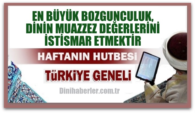 Türkiye Genel... Diyanet İşleri Başkanlığı tarafından hazırlanan “EN BÜYÜK BOZGUNCULUK, DİNİN MUAZZEZ DEĞERLERİNİ İSTİSMAR ETMEKTİR” isimli hutbe 29.07.2016 Cuma günü Türkiye geneli bütün camilerde okunacaktır. Diyanet Cuma hutbesinin tam metnini sitemizden okuyabilir, dilerseniz bilgisayarınıza indirebilirsiniz..