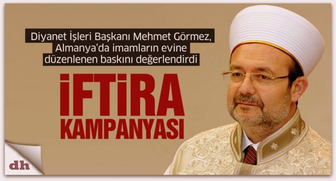 Türkiye’de görev yapan yabancı medya kuruluşlarının temsilcileriyle bir araya gelen Diyanet İşleri Başkanı Görmez, Almanya’da görev yapan din görevlilerinin illegal bir faaliyet içerisinde olmadıklarını kesin bir dille ifade ederek, asılsız bir iddia ile başlatılan algı operasyonuyla Diyanet İşleri Başkanlığı, DİTİB ve din görevlilerinin itibarsızlaştırılmaya çalışıldığını kaydetti.