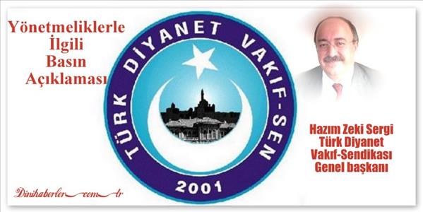 Diyanet-Vakıf-Sen Genel başkanı Hazım Zeki SERGİ' nin Yönetmeliklerle İlgili Basın AçıklamasıYÖNETMELİKLER İLE İLGİLİ BASIN AÇIKLAMASI Diyanet İşleri Başkanlığı Atama ve Yer Değiştirme Yönetmeliği, Görev ve Çalışma Yönetmeliği ile Sınav Yönetmeliğinde yapılan düzenlemeler 17-18.