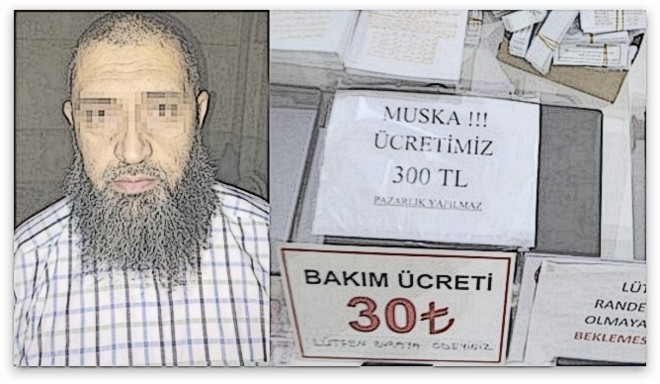 DİYANET HABER- Kartal’da çocuğu olmayan kadınlara muska yazdığı ve cin çıkarma vaadiyle dolandırdığı öne sürülen sahte hoca yakalandı.Sahte hocanın evine yoğunluktan dolayı \"sıramatik\" koyduğu belirlendi. Evin duvarına asılan \"Bakım ücreti 30 lira\", \"Muska ücretimiz 300 lira, Pazarlık yapılmaz\" yazıları dikkat çekti.