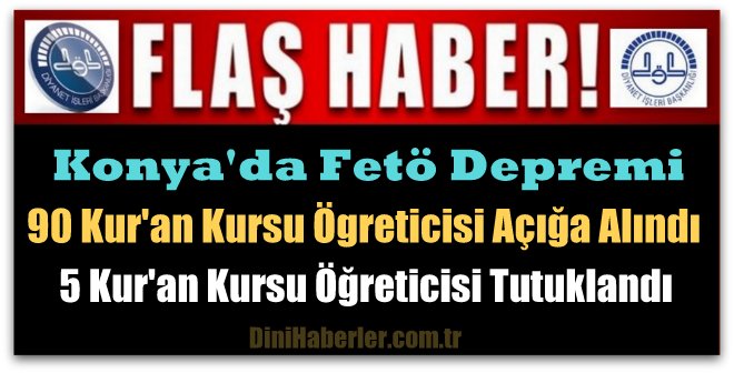 Bu Soruşturmalar kapsamında FETÖ/PDY bağlantısı gerekçesiyle Konya İl ve İlçe Müftülüklerinde açığa alınan personel sayısının bugün itibariyle 90'a ulaştı. Konya Cumhuriyet Başsavcılığı tarafından yürütülen FETÖ/PDY soruşturması kapsamında 5 Kur'an Kurus Öğreticisi gözaltına alındı. Konya İl Emniyet Müdürlüğü’nde işlemleri tamamlanan 5 Kur'an Kurus Öğreticisi, Konya Devlet Hastanesi’nde sağlık kontrolünden geçirildikten sonra adliyeye sevk edildi. Adliye'de sevk işlemleri tamamlanan Kur'an Kursu Öğreticileri cezaevine gönderildi.