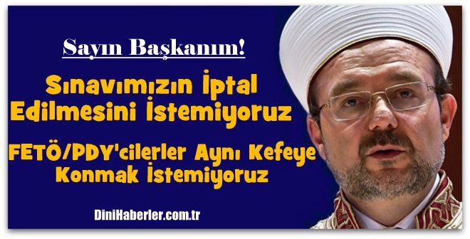 Bugüne kadar Diyanet İşleri Başkanlığını zedeleyecek, kurumumuza halel ve ziyan getirecek hiçbir oluşum ve camianın içinde bulunmayan kişiler olarak bizler bu süreçte başkanlığımızın mağdur olan adaylarını düşünerek mülakat iptal kararının yeniden gözden geçirmesini istiyoruz. İlk hafta içerisinde yapılan mülakatlar iptal değildir diyen Diyanet kurumumuzdan ; mülakatı toptan iptal etse dahi hak ve adaletin tecelli etmesi için hakkıyla mülakattan iyi puan alanların mağdur edilmemesini , kurunun yanında yaşın göz göre göre yakılmamasını ve ayıklama yoluna gidilerek mülakattaki komisyon jürilerinin ortaya çıkarılmasını bekliyoruz. Medyada 15 temmuzdan evvel yapılan mülakatlarda bazı mülakat salonlarındaki Fetöcü jürilerin olduğu ve bunların görevden alındığı için tüm mülakatların iptal edildiği şeklinde açıklamalar var..