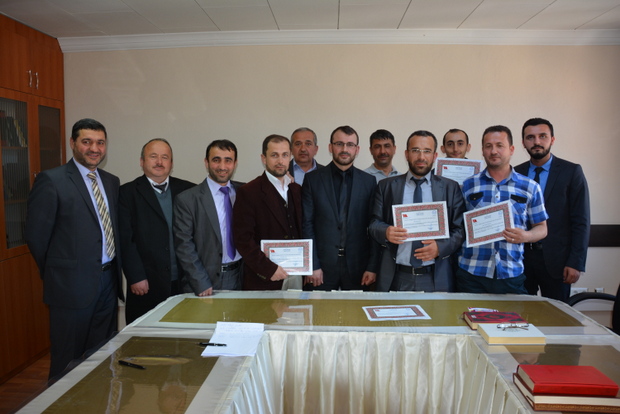 Din görevlilerimizin katıldığı kursun son gününde,İl Müftüsü Mustafa Erkan başkanlığında oluşturulan komisyon tarafından yapılan sınav sonucu, kursiyerlerin tamamını başarılı oldu.Belge merasiminde konuşan İl Müftüsü Mustafa Erkan şunları söyledi “Medine-i Münevvere’den bir adam Dımışk’ta bulunan Ebu-d Derdâ ra. Yanına geldi. Ebu-d Derdâ ra.ona “Kardeşim seni buraya kadar getiren nedir?diye sordu.Adam ona şu cevabı verdi.”Senin Rasülüllah sav’den naklettiğini öğrendiğim bir Hadis-i şeriftir.”dedi. Bunun üzerine Ebu-d Derd ra dediki “rasülüllah sav şöyle buyurdular Kim ilim için yola çıkarsa Allah ona cennete giden yolu kolaylaştırır. Melekler, hoşnutluklarından dolayı ilim talebesine kanatlarını sererler, sudaki balıklara varıncaya kadar yer ve gök ehli alim kişinin bağışlanması için Allah’a yakarır,’ Alimin ,Âbide (ibadet edene )üstünlüğü (parlaklık, görünürlük ve güzellik bakımından) ayın diğer yıldızlara üstünlüğü gibidir. Kuşkusuz Âlimler Peygamberlerin varisleridirler. Peygamberler miras olarak ne altın ,ne de gümüş bırakmışlardır; onların bıraktıkları yegane miras ilimdir.Dolayısıyla kim onu alırsa büyük bir pay almış olur.”Tirimizi Bu Hizmet içi eğitimler bizim ilmimizi ziyadeleştirerek ,daha iyi bir şekilde pekiştirmemize vesile olmaktadır. Dinini en güzel şekilde yaşamak ve anlatmak için Kur’an-ı Kerimin hatasız okunmasını sağlamak, görevlilerimizin bu konudaki bilgi ve becerilerini geliştirmek amacıyla düzenlediğimiz kursumuzun sonuna geldik.Rehber öğreticimiz Abdullah Ergin hocama özverisinden dolayı teşekkür ediyorum. Arkadaşlarımızın başarılı çalışmalarının devamını yüce rabbimden niyaz ediyorum” dedi.