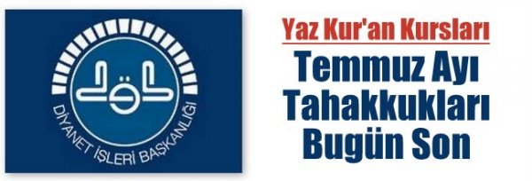 Diyanet İşleri Başkanlığı 2015 Yaz Kur'an Kursları Temmuz ayı Puantaj doldurma işlemleri resmi görevliler için 2 Ağustos 2015 tarihinde sona erecek. Yaz kursu döneminde ücretli çalışanlar ise 15-16-17 Ağustos tarihlerinde tahakkuk beyanlarını yapmaları gerekiyor.