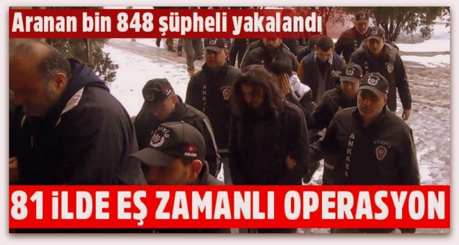 Emniyet Genel Müdürlüğü'nden yapılan yazılı açıklamada, hakkında yakalama kararı bulunan kişilere yönelik, 81 ilin emniyet müdürlüğünce il ve ilçelerde eşzamlanlı operasyonlar gerçekleştirildiği belirtildi. 12 bin 420 personelin görev aldığı, 5 bin 021 adreste arama yapıldığı belirtilen açıklamada, aranan 1848 kişinin yakalanarak ilgili adli makamlara teslim edildiği ifade edildi.