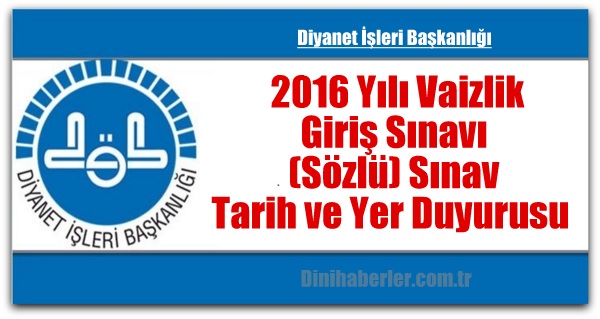Diyanet İşleri Başkanlığı İnsan Kaynakları Genel Müdürlüğü tarafından 2016 Yılı Vaizlik Giriş Sınavı (Sözlü) Sınav Tarih ve Yer Duyurusu yayınlandı. Sınava girecek adaylar, sınav giriş belgelerini DİBBYS sistemine (https://dibbys.diyanet.gov.tr) giriş yaparak alabilirler.