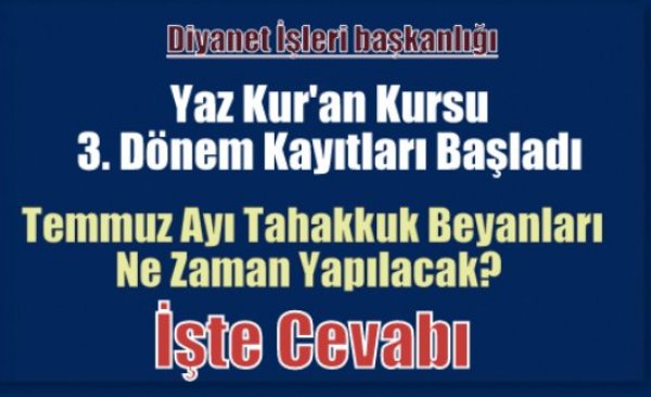 Yaz Kur'an Kursu 3. dönem kayıtları başladı ve Temmuz Ayı Tahakkuk Beyanını doldurma işlemi cuma günü başlıyor.