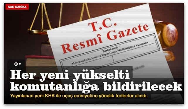 DİYANET HABER-Yeni Kanun Hükmünde Kararname yayınlandı. Yayınlanan KHK\'da helikopter kazası sonrası alınacak önlemler düzenlendi. Alınan tedbirler çerçevesinde her yeni yükselti Harita Genel Komutanlığına bildirilecek.