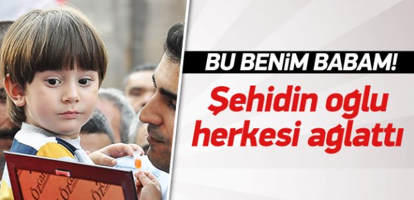 Kayseri’de, şehit babası Oktay İzgi’nin fotoğrafını gösterip “Bu babam” diyen 3 yaşındaki Eymen, törene katılanları ağlattı.