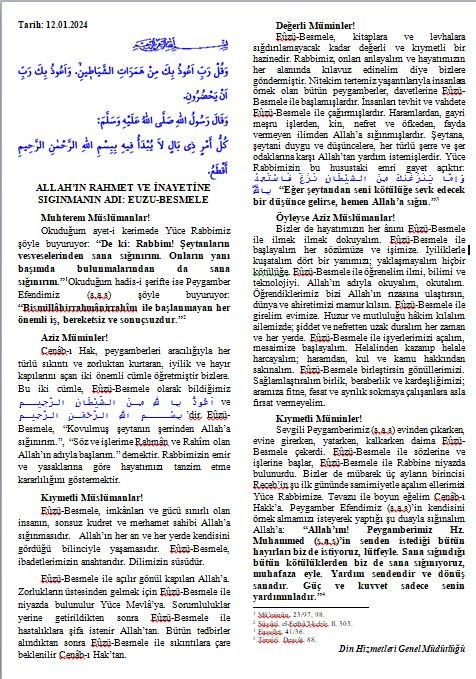 Diyanet İşleri Başkanlığı tarafından hazırlanan " ALLAH’IN RAHMET VE İNAYETİNE SIĞINMANIN ADI: EÛZÜ-BESMELE" konulu 12 Ocak 20224 Tarihli Cuma Hutbesinin tam metnini sitemizden okuyabilir, dilerseniz bilgisayarınıza indirebilirsiniz..